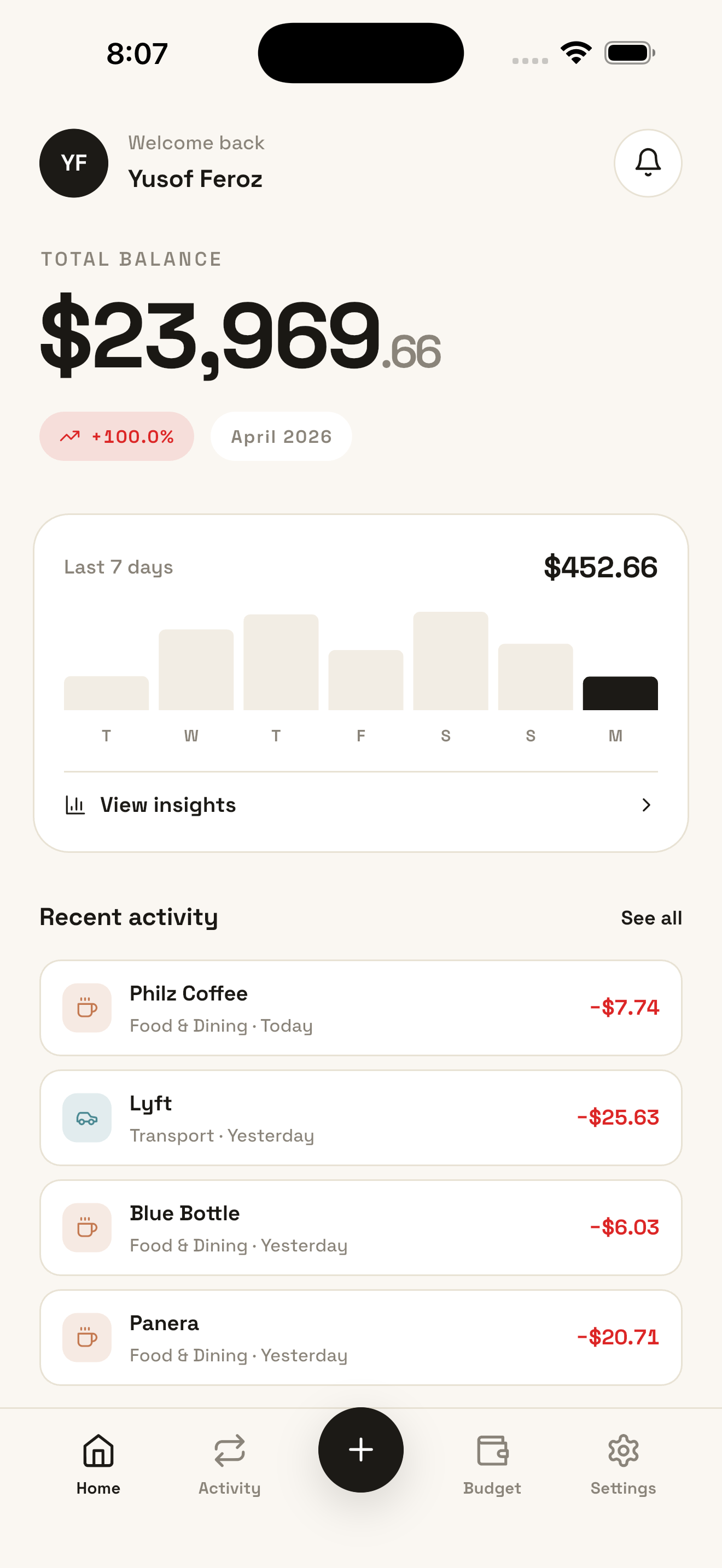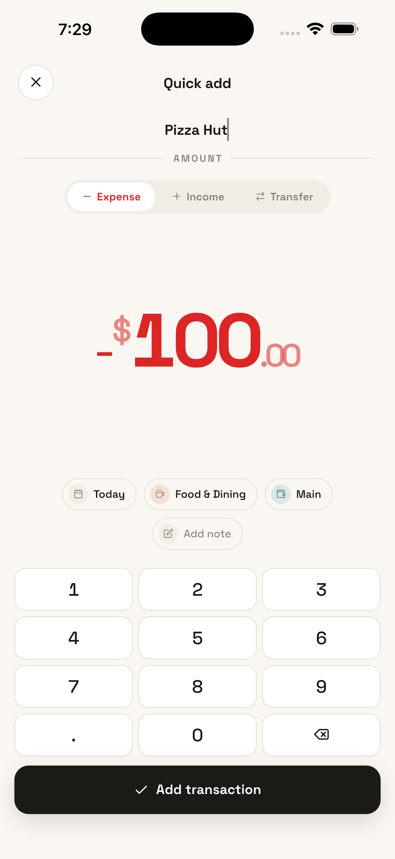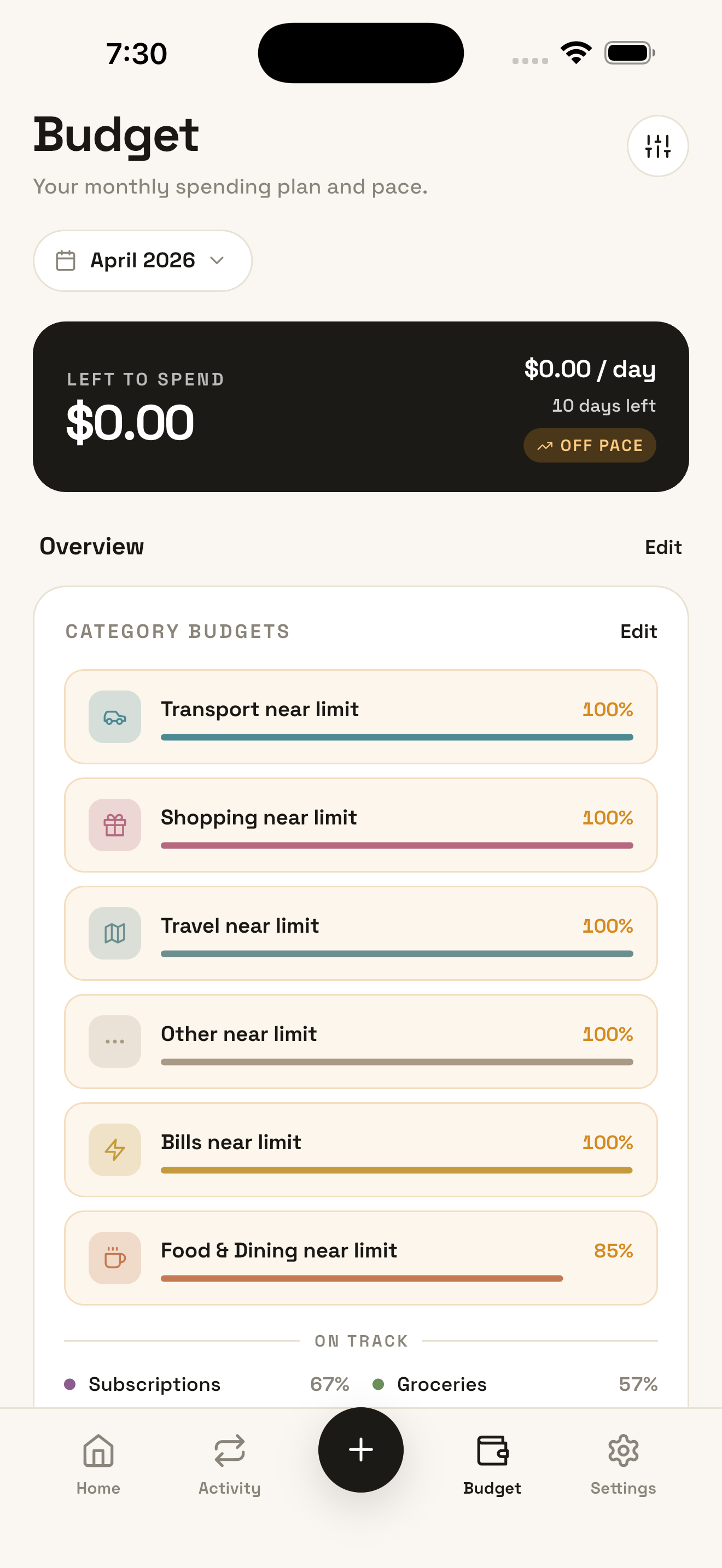 Tap +, type an amount, pick a category. Centsly remembers merchants, suggests defaults, and gets out of the way. No receipts, no CSV imports.